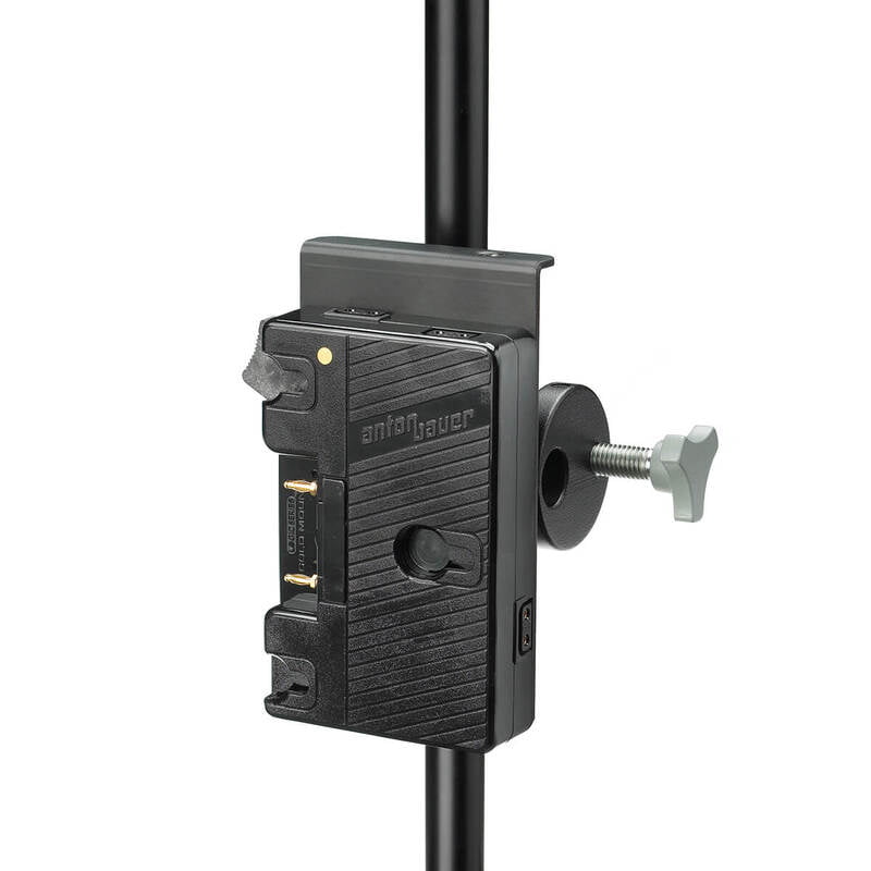 The QRC-LG Battery Plate with Clamp from Anton Bauer provides Gold Mount battery power, flexibility, and added convenience to the Litepanels Sola ENG Flight Kit. Integrated into the Gold Mount design is the Manfrotto Mini Clamp, which allows the QRC-LG to be mounted to a variety of lighting stands.