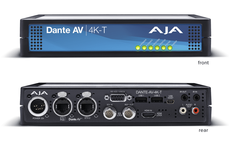 AJA Dante AV 4K-T and Dante AV 4K-R utilize the new Dante AV Ultra solution that enables networked video to be used alongside the industry leading Dante audio-over-IP platform on standard 1 GigE IP networks.