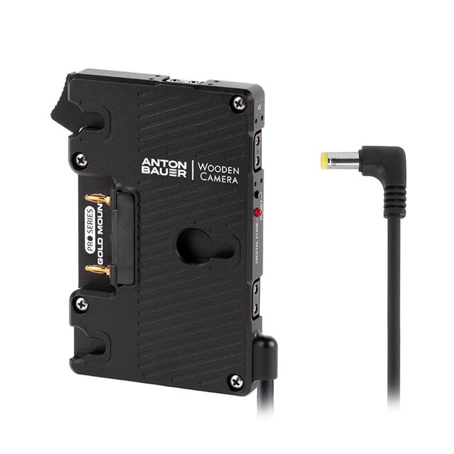 Gold Mount power plate, with a rugged aluminum body for durability and secure battery mounting and a C-Series DC connector. Features 3x P-Taps for accessory power at battery voltage (12-16V), a digital fuse with reset button, rear cover plate, and captive mounting screws.
