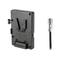 Wooden Camera brand V-Mount plate with a Blackmagic Pocket Cinema Camera 4K / 6K connector and 2x P-Tap ports to power camera accessories. Cable exits the right side of the plate allowing neat looping and insertion into the camera.