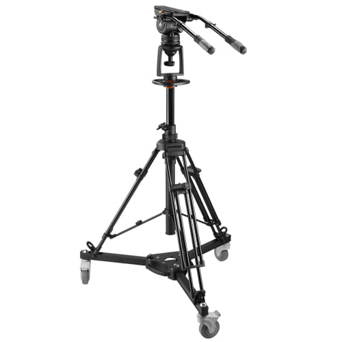 Transport your camera around the set or studio smoothly and quickly with this Air-Assist Pedestal with Height-Adjustment Lever from E-Image. This pedestal is made up of the heavy-duty 7103H fluid head with P3 quick release plate, the AT7903A tripod pedestal, the EI-7005 tripod dolly, two GB3 padded pan handles, and a carry bag.