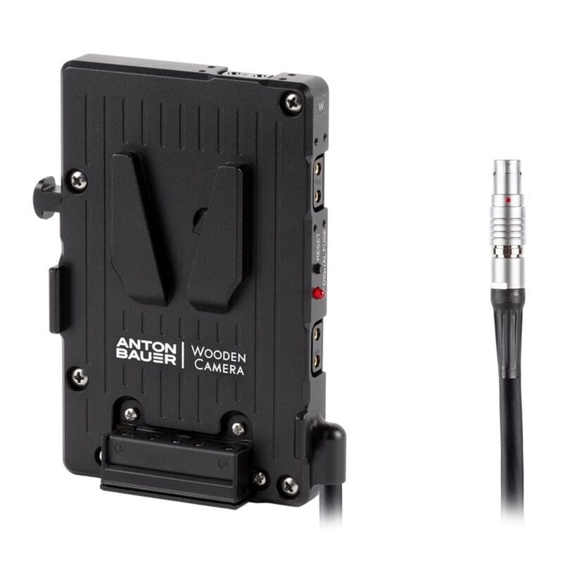Pro V-Mount (RED DSMC1/DSMC2)) with a rugged aluminum body for durability and secure battery mounting and a RED DSMC1/DSMC2 LEMO compatible connector. Features 3x P-Taps for accessory power at battery voltage (12-16V), a digital fuse with reset button, rear cover plate, and captive mounting screws.