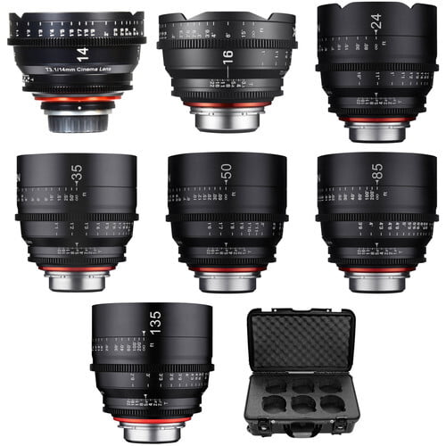 This B&H Kit of seven Xeen Cinema Lenses includes the 14, 16, 24, 35, 50, 85, and 135mm lenses. This provides you with a full, color-matched set of lenses that cover full frame and are fitted with Sony E-mounts.