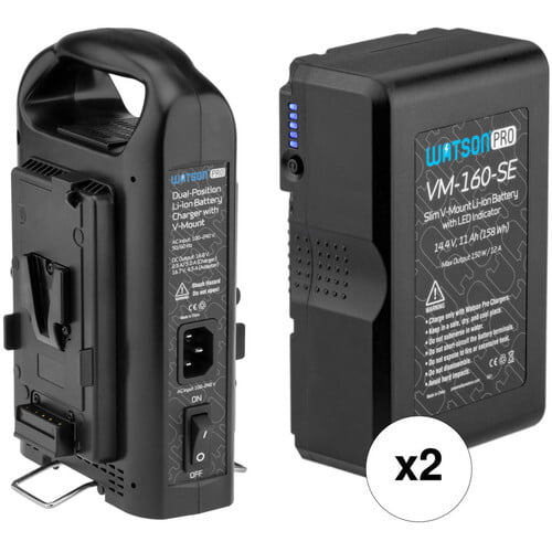 This B&H kit pairs two V-mount Watson Pro 14.4V 158Wh Slim Li-Ion Batteries with a Watson Pro Dual-Bay Charger.