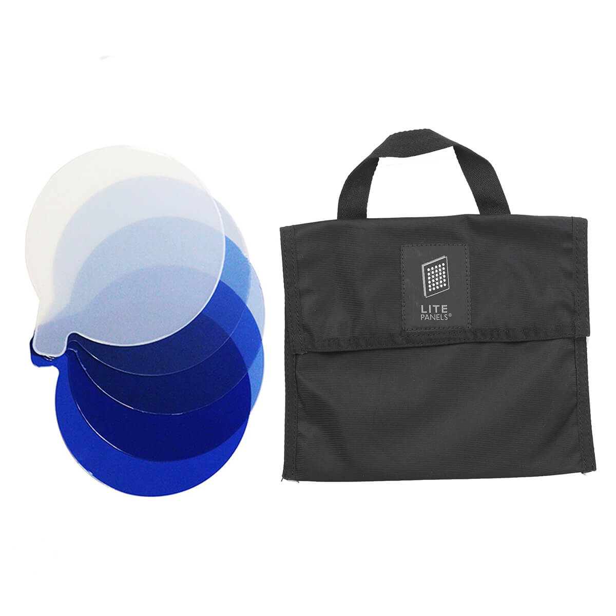 The Litepanels Inca 4" LED Fresnel 5-Piece CTB Gel Filter Set is comprised of one each Full, 1/2, 1/4, 1/8 CTB and one Opal Frost Diffusion filter. The blue filters are used to cool the Inca's tungsten-balanced output to match daylight shooting situations or other daylight-balanced fixtures. The filters store in the included fabric bag.