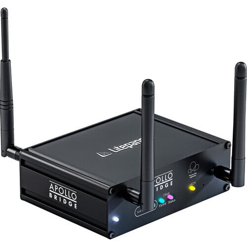 The Apollo Bridge is one component of a two-part system that allows a DMX link to Litepanels DMX compatible fixtures and other DMX controllable units while acting as a "bridge" for LumenRadio CRMX for wireless DMX communication to fixtures, and E1.31 sACN over Wi-Fi or Ethernet for direct control from a mobile device, computer, or lighting console. The Bridge, used with compatible Litepanels lights, offers a system with a constant signal capacity and the ultimate in wireless control.