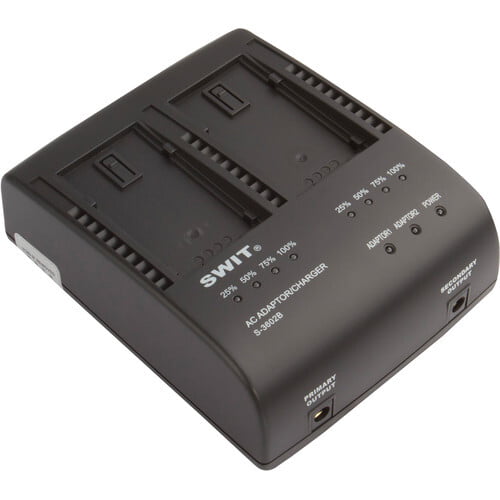 The SWIT S-3602B Dual Charger/Adapter has two charging channels with 7-8.4 VDC, 2A output each for simultaneously charging two batteries.