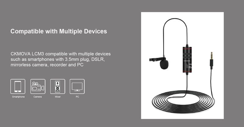Omnidirectional condenser microphone •Clip-On Mic for Smartphone, DSLR, Audio recorders and PC •Powered by one LR44 battery(included) •All metal construction •8m(26ft) cable fits various using conditions •Includes lapel clip, foam windscreen, 1/4''adapter