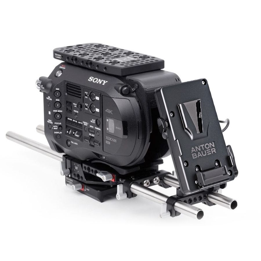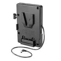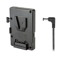 V-Mount battery plate with a DC connector compatible with Sony PXW-FS7, FS7mkII, FS5, and Panasonic EVA1 and 2x P-Tap ports to power camera accessories. This model also works with Sony EX3 cameras. Cable exits the right side of the plate allowing neat looping and insertion into the camera.