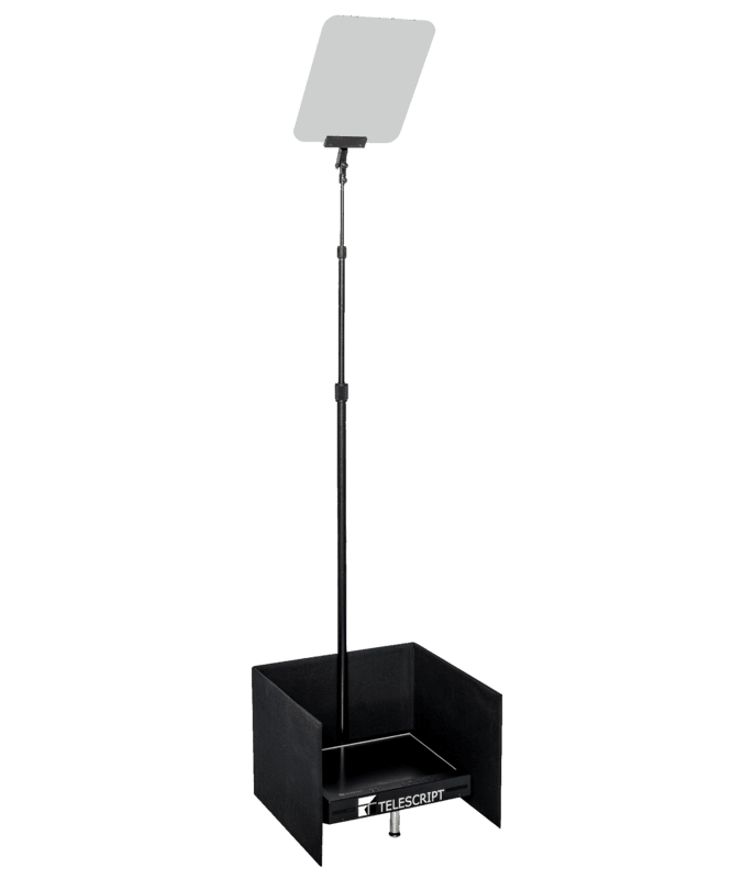 1 - 17” daybright flatpanel prompter monitor (SDI, VGA, Composite, HDMI), Telescript Unibase with adjustable feet, three tier telescoping pole, adjustable mirrorview clamp, 12” x 14” beamsplitter, 12” matte black semi-rigid surround (please note: two PRS-150 units required for full setup)